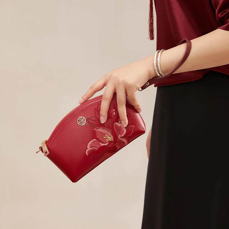 レザー刺繍 レッド マグノリア レディース ハンドバッグ 財布