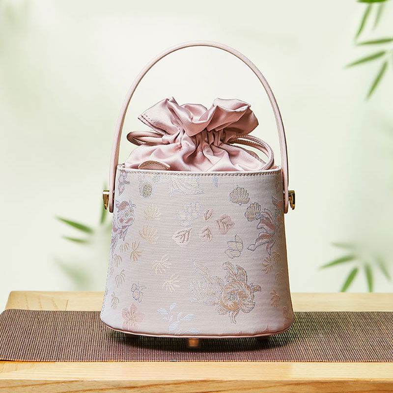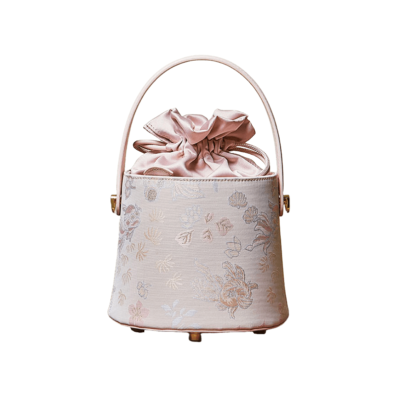 Brocade Jacquard Leather Drawstring Floral Powder Pink Bucket Bag