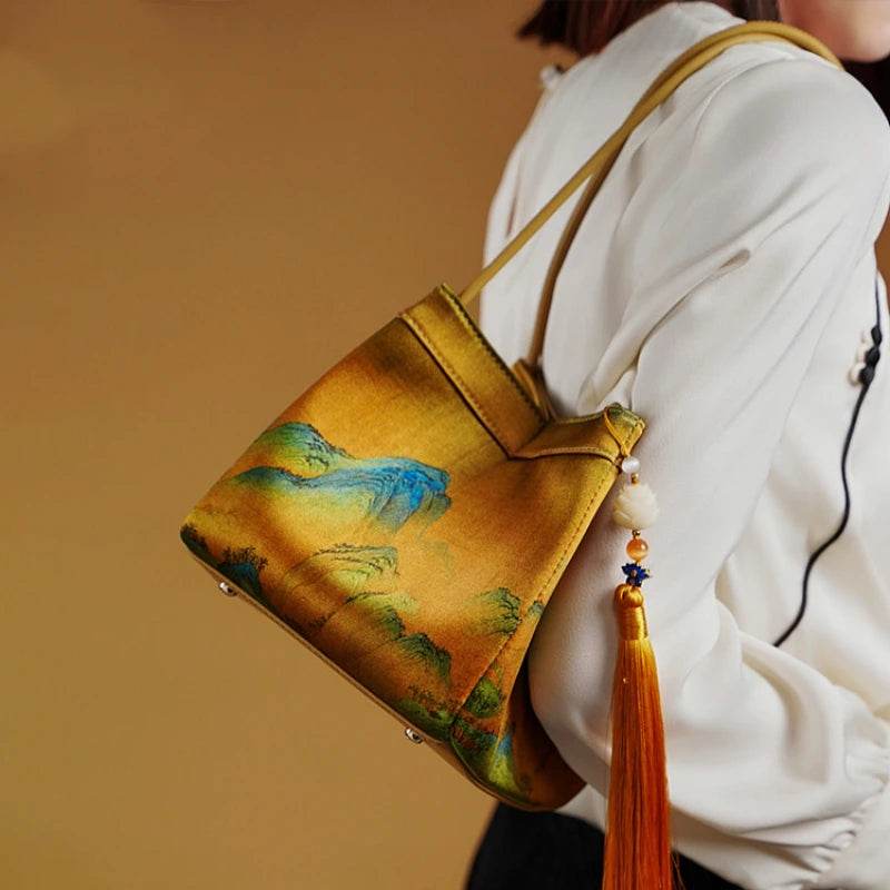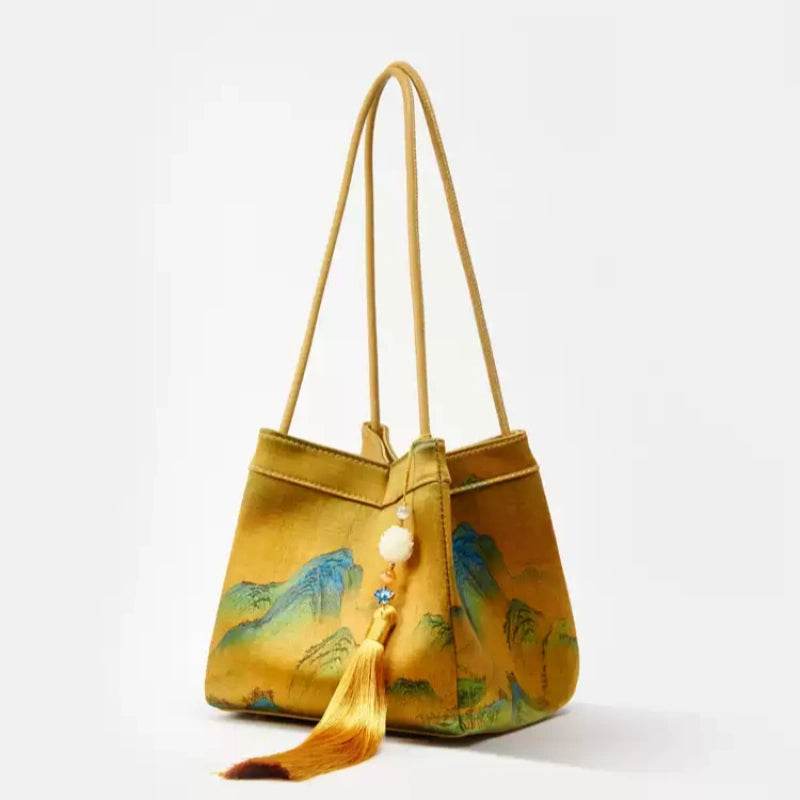 Chinese Painting Mulberry Silk Bucket Bag Vintage Handbag