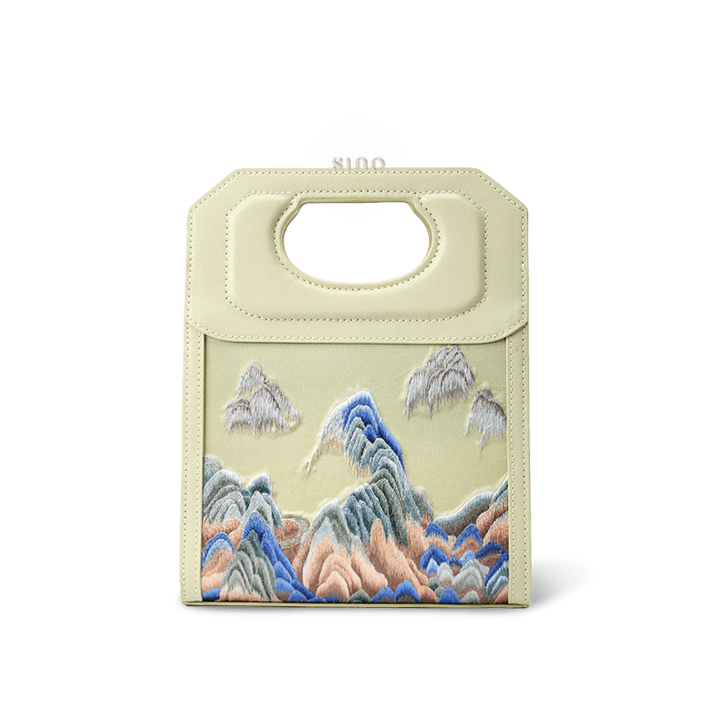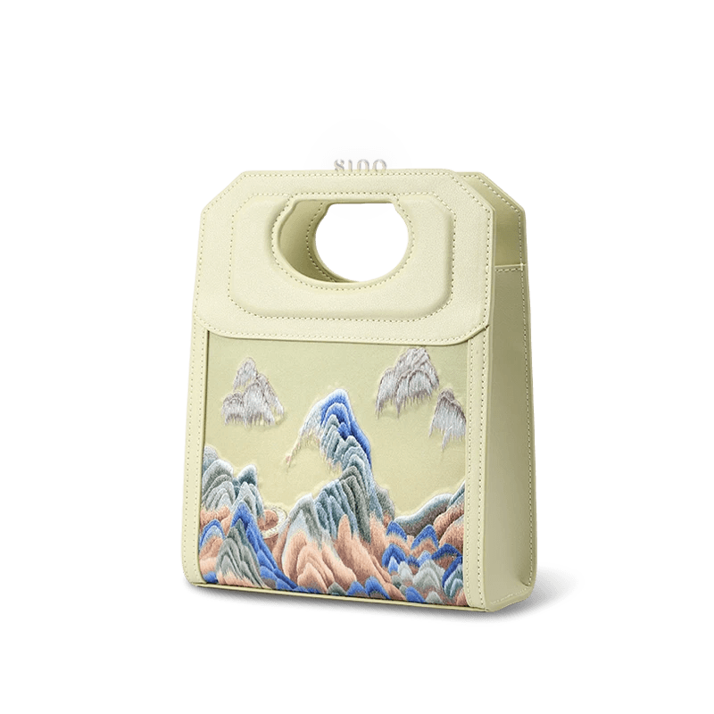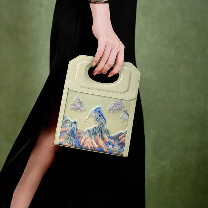 Chinoiserie Mountains Painting Hand Embroidered Leather Handle Bag